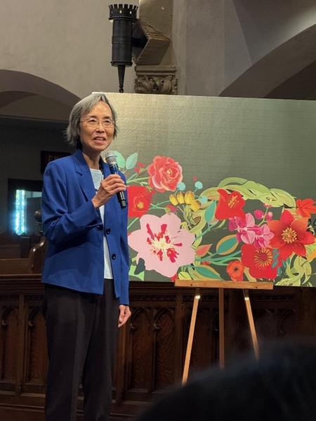 Photo caption: Dr Kwok Pui Lan addressing the symposium with an image of flowers from across the world representing the diversity of the Anglican Communion